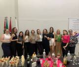 Posando para a foto temos várias mulheres jovens lado a lado, vestidas de maneira esporte e sorridentes. Todas estão segurando taças nas mãos para um possível brinde. À frente delas observamos uma mesa farta com vários petiscos, garrafas de bebidas, um sino rotário, um suporte com guardanapos de papel, taças e copos plásticos.