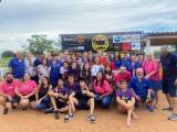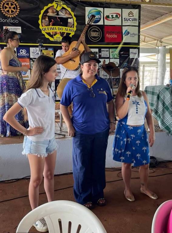 Audiodescrição: na foto, algumas adolescentes identificadas e uma jovem senhora no centro, uma lado a lado de outra, todas sorriem e algumas se abraçam. Atrás delas, um dropbox com vários logos de patrocinadores, no centro logo da queima do alho de José Bonifácio e lado esquerdo simbolo Rotary Club de José Bonifácio.