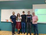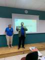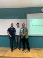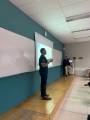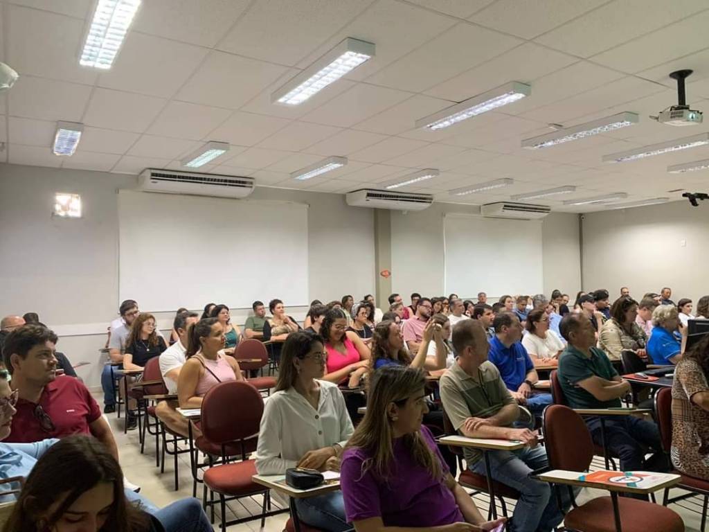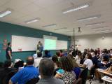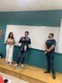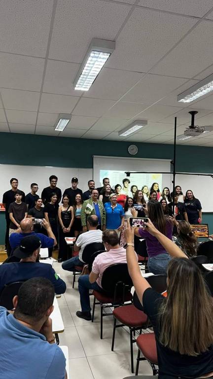 Audiodescrição: na foto, várias pessoas identificadas na frente de uma sala, lado a lado, maioria sorri, de frente pra eles algumas pessoas sentadas, olhando e tirando foto desse pessoal em pe na frente da sala. Atrás do pessoal em pé, uma lousa branca e um telão.