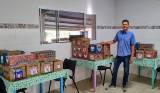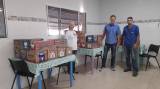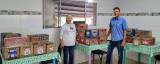 Audiodescrição: na foto, 3 pessoas identificadas, dois homens do lado direito, lado a lado, entre eles e a terceira pessoa que é uma mulher tem várias caixas e leite em cima de uma mesa, atrás dos homens e do lado da mulher mais mesa com caixa de leite.