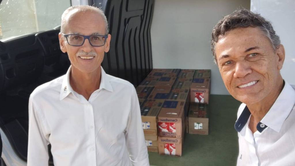Audiodescrição: duas fotos uma em cima da outra, a de cima, mostra dois senhores e várias caixas de leite atras, a de baixo, mostra 4 pessoas com uma mesa atras delas e várias caixas de leite em cima. Todos sorriem.