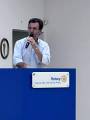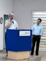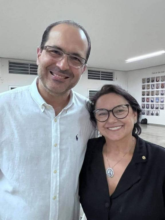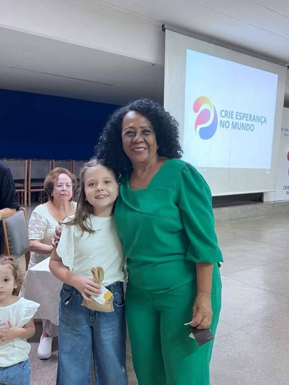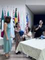 Audiodescrição: na foto, duas mulheres identificas, estão em pe, em frente duas cadeiras e uma mesa, onde tem um sino rotário, agua e computador, toalha na mesa é branca rendada. Atrás das mulheres o pavilhão de bandeiras. As mulheres estão serias.