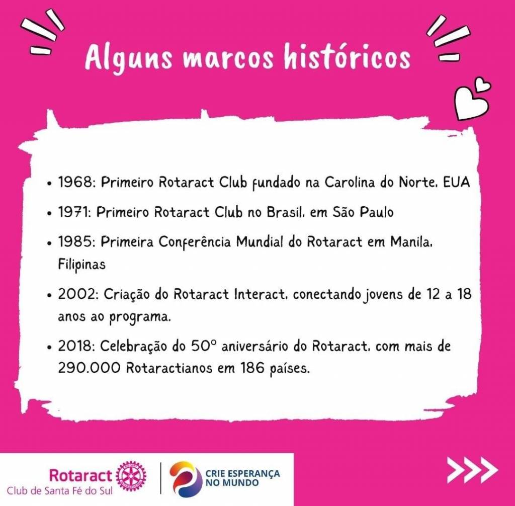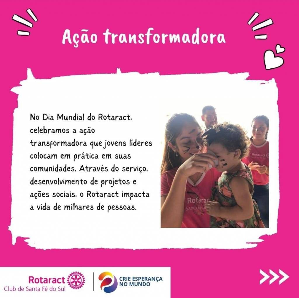 Audiodescrição:Card com fundo mesclado branco clarinho escrito ao centro em Rosa e centralizado com letras maiúsculas e grandes: 13 de março, Dia Mundial do Rotaract. E na sequência a logo do Rotary Club de Santa Fé do Sul. Abaixo. Abaico escrito com letra preta centralizada em fundo rosa: Hoje, festejamos a fundação do primeiro Rotaract Club e damos os parabéns a todos os jovens que Criam Esperança no Mundo, transformam Comunidades e encontram soluções, local e globalmente, com determinação, integridade e inteligência, unindo esforços para criar iniciativas com impacto e sustentáveis a longo prazo.