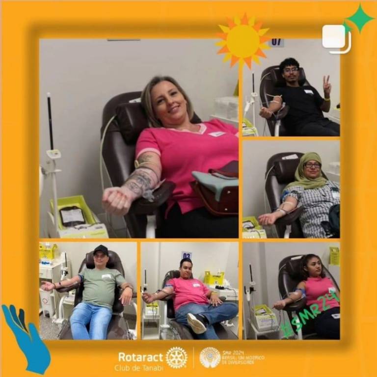 Audiodescrição: na foto, de borda contornada em amarelo, no centro, várias pessoas identificadas em pe, lado a lado, na frente delas escrito: Salvando vidas e atrás, uma faixa pendurada numa parede : mostre a solidariedade que corre em suas veias e ao lado desenho de uma gota de sangue #doe sangue. No topo, lado esquerdo: terceiro dia 13/03 e no rodapé simbolos Rotaract Club de Tanabi e SMR24 Brasil um mosaico de diversidade.