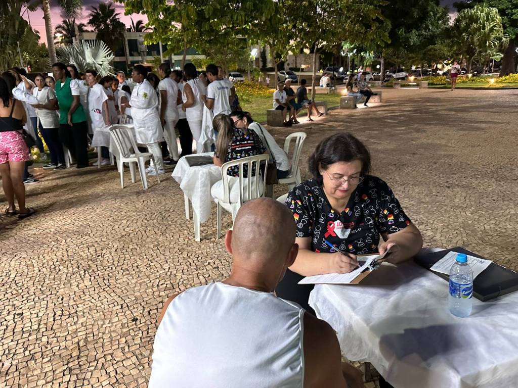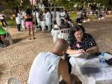 Audiodescrição: na foto, uma jovem loira, de cabelos amarrados, esta sentada de frente a uma mesa, do outro lado tem uma senhora, a jovem loira está fazendo teste de hepatite na senhora, usa luvas, em cima da mesa vários papeis e canetas, atrás, imagem de varias cadeiras e mesas plasticas vermelhas, nota-se também um canteiro de grama.