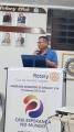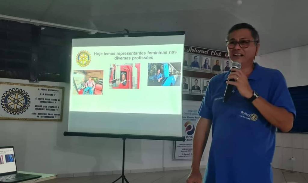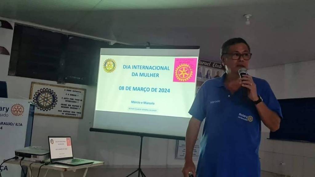Audiodescrição: na foto, uma senhor, de cabelos escuros, usa oculos e camiseta azul do Rotary, sorri e fala ao microfone, atrás dele, um telão com a frase: Dia Internacional da Mulher 08 de março de 2024 e simbolo da roda rotária no topo.