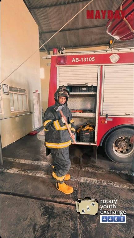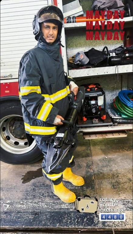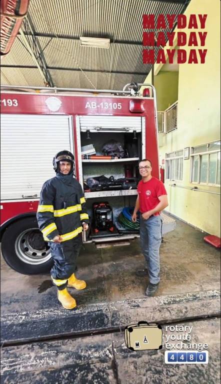 Audiodescrição: na foto, um jovem veste uma roupa inteira equipada do corpo de bombeiros e faz um Joia co mas duas mãos. Do lado direito no topo: mayday, mayday, mayday, na parte inferior da foto, rotary youth exchange Distrito 4480 e desenho da uma malinha.