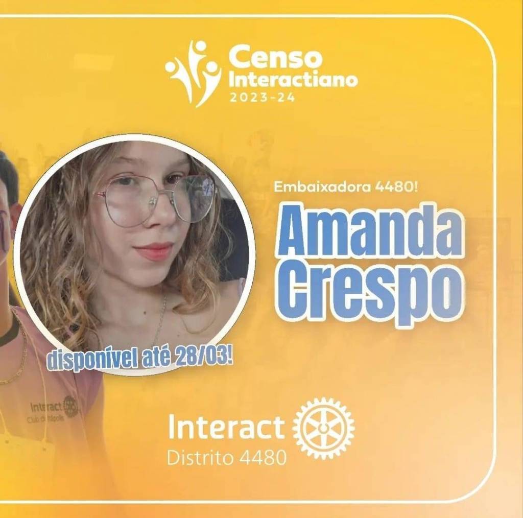 E para nos guiar neste censo, anunciamos como Embaixadora a queridíssima Amanda Crespo, associada ao Interact Club de Votuporanga, a Terra das Brisas Suaves!