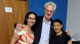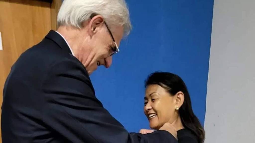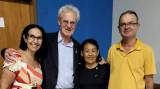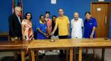 Na foto várias pessoas estão de pé atrás de uma mesa grande de madeira. Da esquerda para a direta temos o casal Gov do Distrito 4480, Pavam e Rita acompanhados de várias pessoas, dentre elas 2 vestem camiseta azul do Rotary. Em cima da mesa no centro temos um sino rotário e uma das pessoas segura o martelo de madeira.
