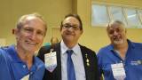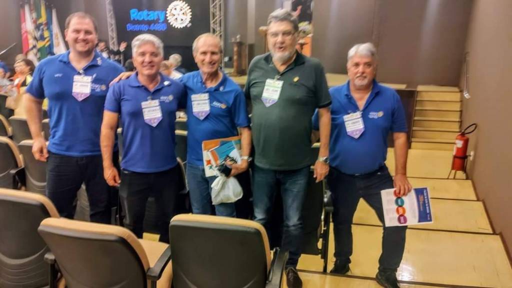 Na foto 5 homens estão sorrindo, da esquerda para a direita somente o quarto homem não veste camiseta azul do Rotary. Todos estão com um crachá grande de papel pendurado no pescoço e dois deles tem nas mãos pastas de papel coloridas.