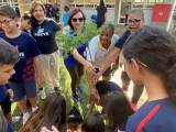 Na foto vários jovens entre meninos e meninas e 4 mulheres estão em um lugar aberto, ensolarado, arborizado onde a maioria veste camiseta azul marinho iguais. Eles posam ao lado de uma muda de árvore que deverá ser plantada em um local que já está devidamente escolhido. Observamos construções ao lado direito e atrás e muitas grades brancas dividindo ambientes. Todos estão sorrindo.