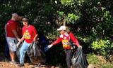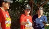 Na foto várias pessoas entre homens e mulheres a maioria vestindo camiseta da campanha End Pólio Now, boné e óculos escuros, seguram nas mãos uma grande faixa com os dizeres da esquerda para a direita: Contra Dengue (desenho de um mosquito com uma faixa vermelha de exclusão em cima dele) e finalizando no canto inferior direito : Votuporanga contra o Aeds Aegypti. O dia está bastante ensolarado e atrás deles observamos muitas árvores de copas grandes e bem verdes.