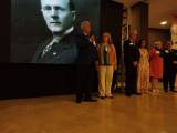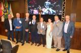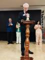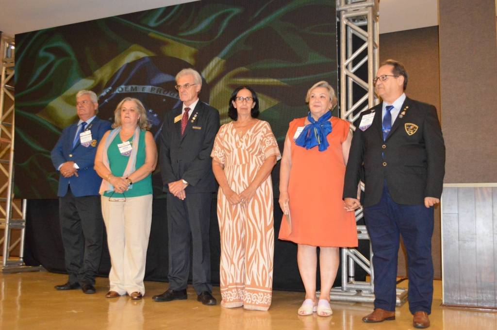 Audiodescrição: na foto, 3 casais identificados, no fundo, um telão com a bandeira do Brasil, na frente dos casais, uma mesa pequena redonda, com sino rotário em cima. Os casais são respectivamente da direita para esquerda, Eder Bocchini e esposa, Gov. Pavam e esposa, Cavichia e esposa.