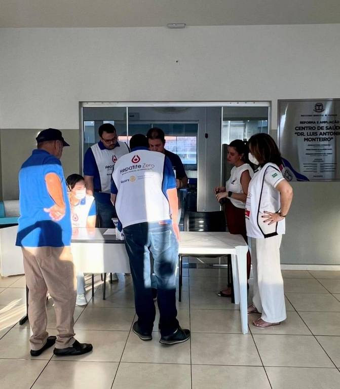 Audiodescrição: na foto, 6 pessoas identificas em pé, no meio delas um banner sobre a campanha Hepatite Zero. Estão todos sorridentes, em frente a um predio com identificação de Centro de Saúde.