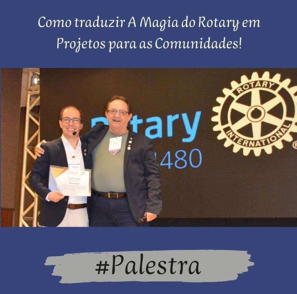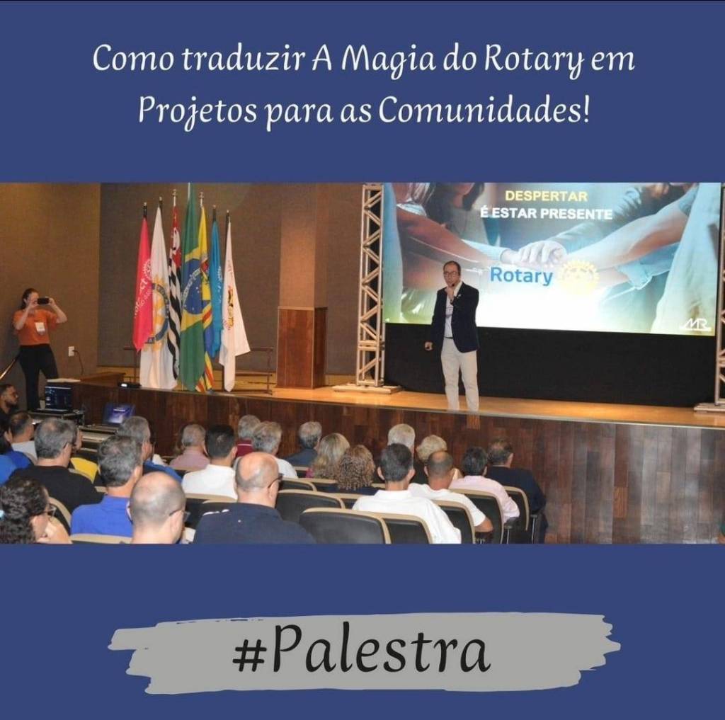 Audiodescrição: na foto, ao fundo imagem de um palco com um telão bem grande de fundo azul, em cima do lado esquerdo : Como traduzir, no centro, desenho do lema A magia do Rotary e abaixo, lado direito Em projetos para as comunidades. Lado esquerdo desenho da roda rotária e Rotary Distrito 4480. Na frente desse telão, um rapaz, usa paletó azul, camisa branca, calça clara, usa óculos, calvo um microfone portatil atras da orelha, apontas a duas mãos para o telão, bem sorridente. No topo de foto escrito como traduzir a magia do rotary em projetos para a comunidade e no rodapé da foto, uma faixa #palestra.