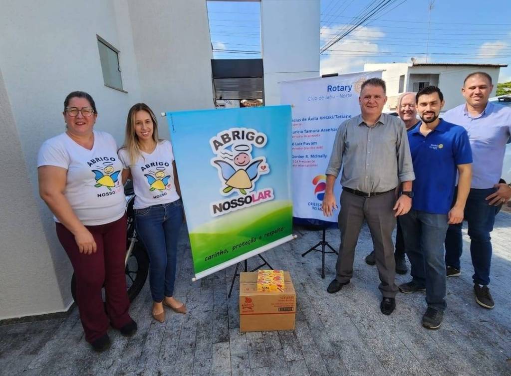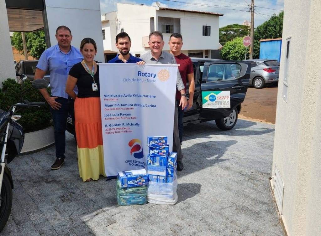 Audiodescrição: na foto, 4 homens identificados, todos posam para foto, em pé e seguram uma caixa de chocolate. Atrás deles uma perua kombi, nela pendurado um banner do Rotary Club de Jahu Norte com nomes e desenho do lema rotário crie esperança no mundo.