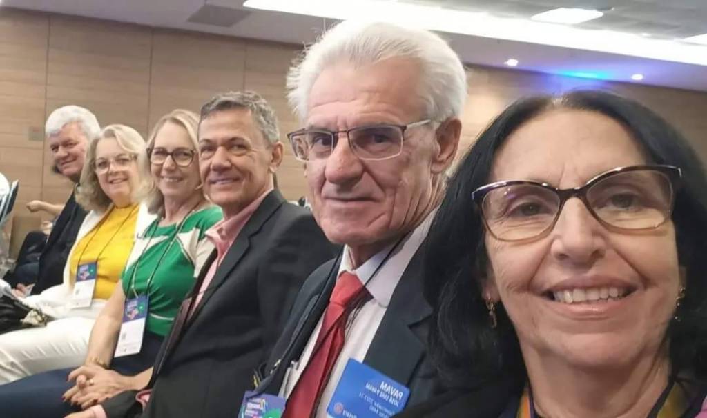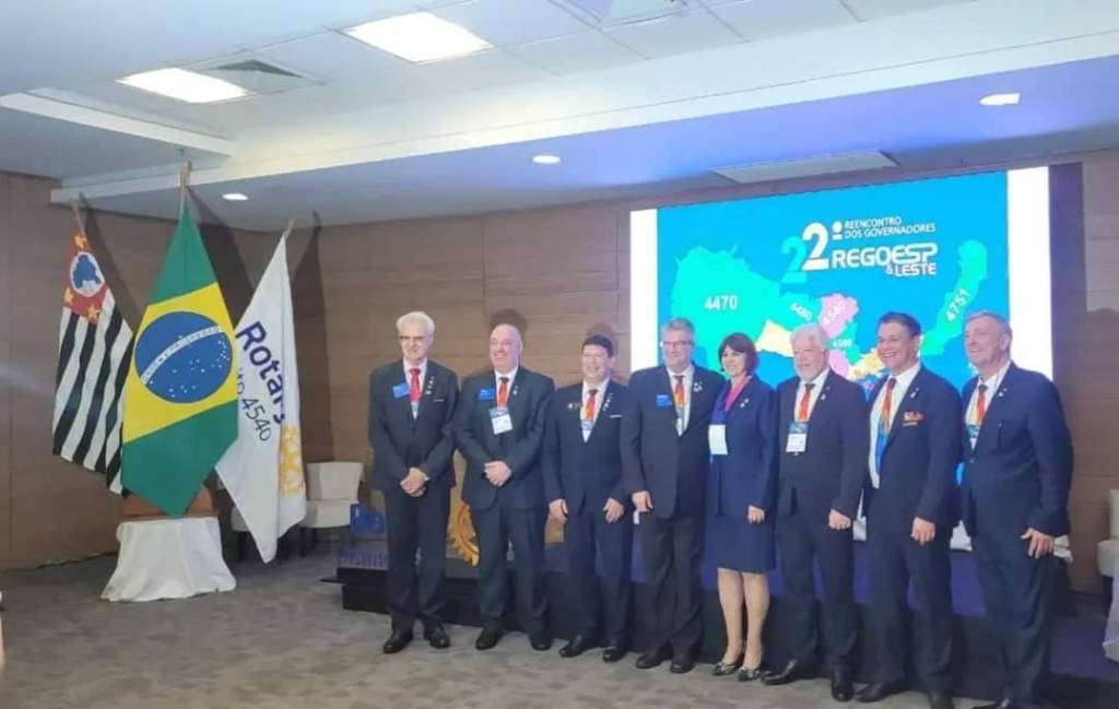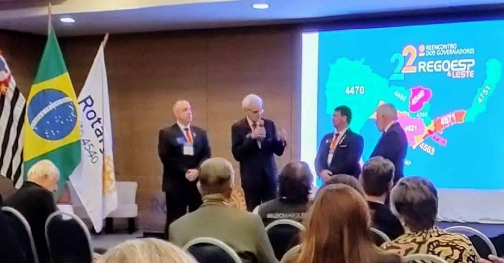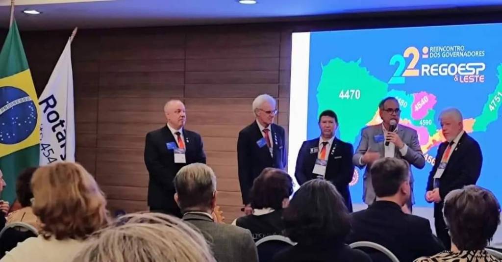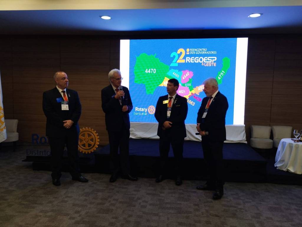 Provavelmente o local é um auditório fechado pois observamos pessoas sentadas de frente para eles ouvindo atentamente as palavras proferidas. O fundo é de madeira escura e do lado esquerdo observamos 2 bandeiras: a do Brasil e a outra do Rotary. Do lado direito um grande telão com imagens de um mapa e 22° reencontro dos govs. Regoesp & Leste.