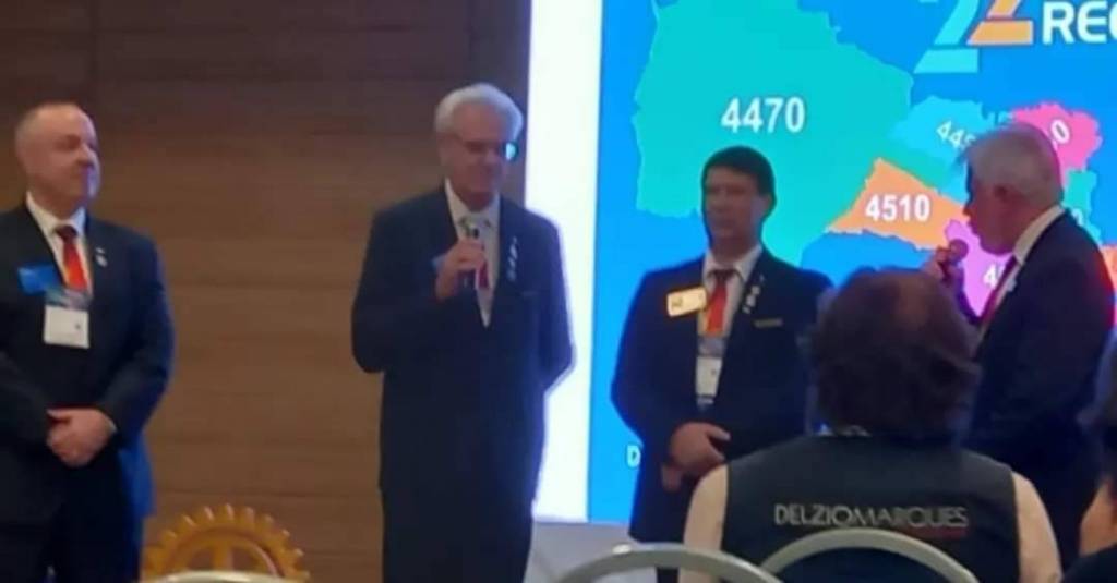 Na foto 5 homens formalmente vestidos são identificados. Somente o 4° da esquerda para a direita que inclusive está discursando com um microfone nas mãos usa terno cinza, os demais usam terno escuro. Podemos destacar o 2° da esquerda para a direita como sendo nosso Gov do distrito 4480 José Luíz Pavam.