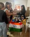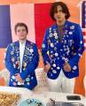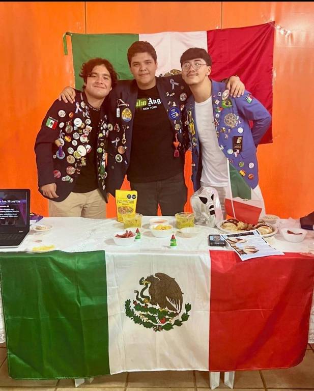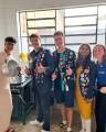Audiodescrição: na foto, 4 pessoas identificadas, duas à frente de uma mesa, com toalha de renda branca, do lado direito uma jovem loira, usa camisa do Rotary azul, do lado esquerdo um jovem tambem usa camisa azul do Rotary, eles seguram algo na mão. Atrás da mesa, duas jovens, lado a lado, usam paleto escuro com varios bótons, todos estão sorridentes na foto. Atrás, na parede, lado a lado, a bandeira dos EUA e da Alemanha.