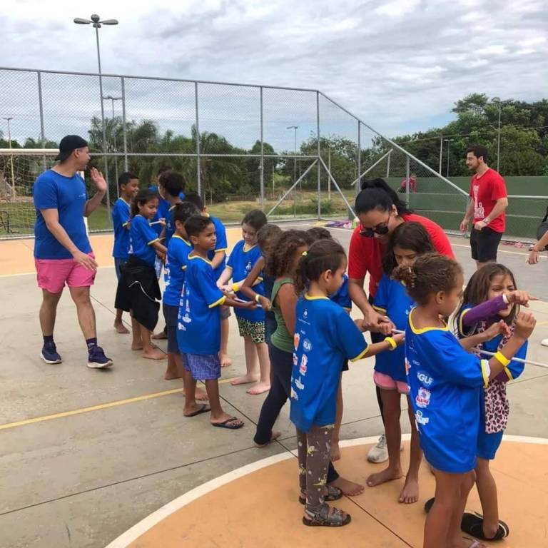 Audiodescrição: na foto, 4 crianças sentadas no chão, cada uma segura um ovo de páscoa nas mãos, uma jovem esta abaixando e dando um achocolatado para elas. Parecem estar sentadas em uma quadra de esportes.