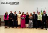 Audiodescrição: na foto, várias pessoas em pé e outras agachadas, posam ara foto, atrás deles um pavilhão de bandeiras, e na parede, lado esquerdo da foto, Sala das sessões Ricieri Rodante e do lado direito na parede, um telão com imagem de da mesma sala de forma mais ampla, onde se nota presença de cadeiras em um auditório.