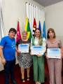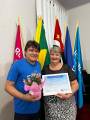 Audiodescrição: na foto, várias mulheres e uns homens posam par foto, a maioria em pé, lado a lado e parte deles agachados, atrás deles, o pavilhão de bandeiras, 3 das mulheres seguram um tipo de certificado.
