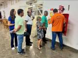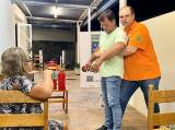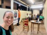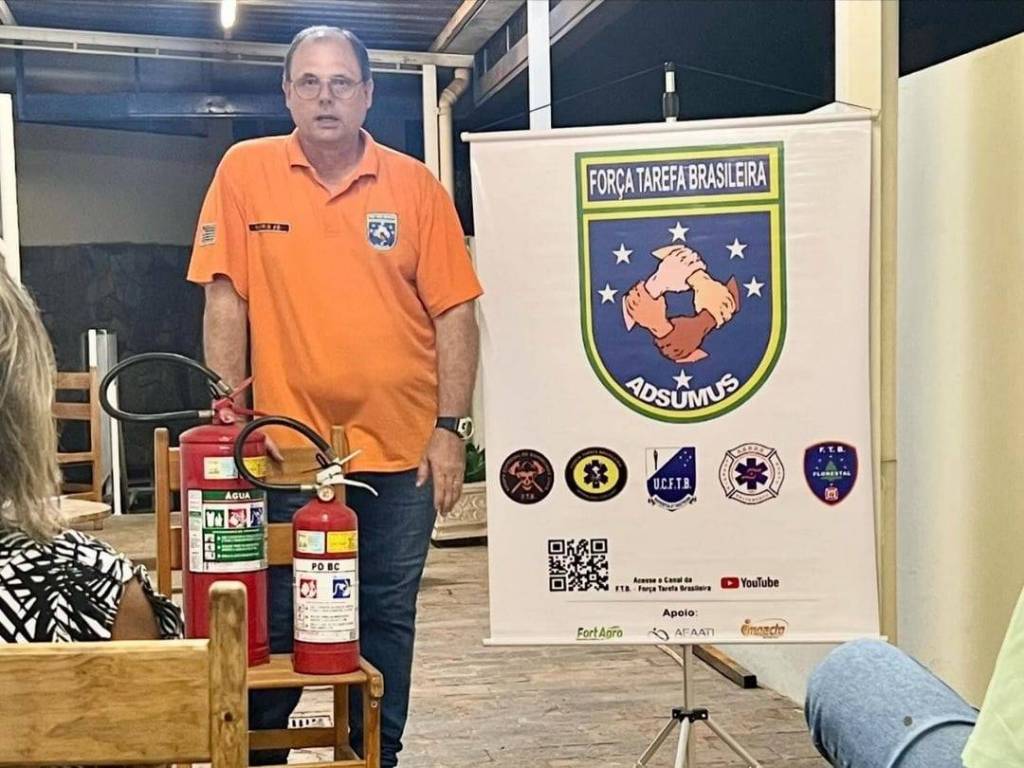 Audiodescrição: na foto, algumas pessoas sentadas a fundo, na frente uma mesa redonda de madeira com papel e garrafa em cima. Ao lado, uma cadeira e em cima dela um extintor de incêndio. Lado esquerdo, próximo a parede, um rapaz de camiseta laranja, usa óculos e fala algo. Ao lado dele um banner, com simbolo Força Tarefa Brasileira, alguns outros simbolos e um QRCode.