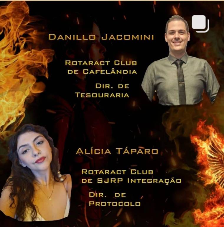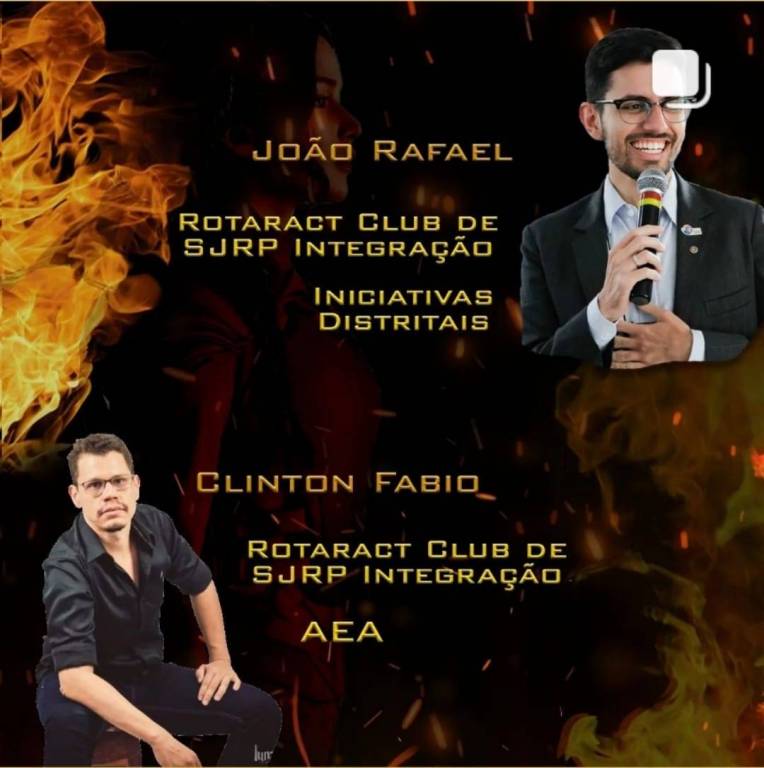 Audiodescrição: no card, de fundo com imagens com chamas de fogo e faíscas, lado esquerdo inferior desenho de uma águia pegando fogo. No titulo: Apresentação dos facilitadores da ADIRC. No rodapé, lado direito, simbolos Rotaract Distrito 4480 e Rotaract Club de José Bonifácio.