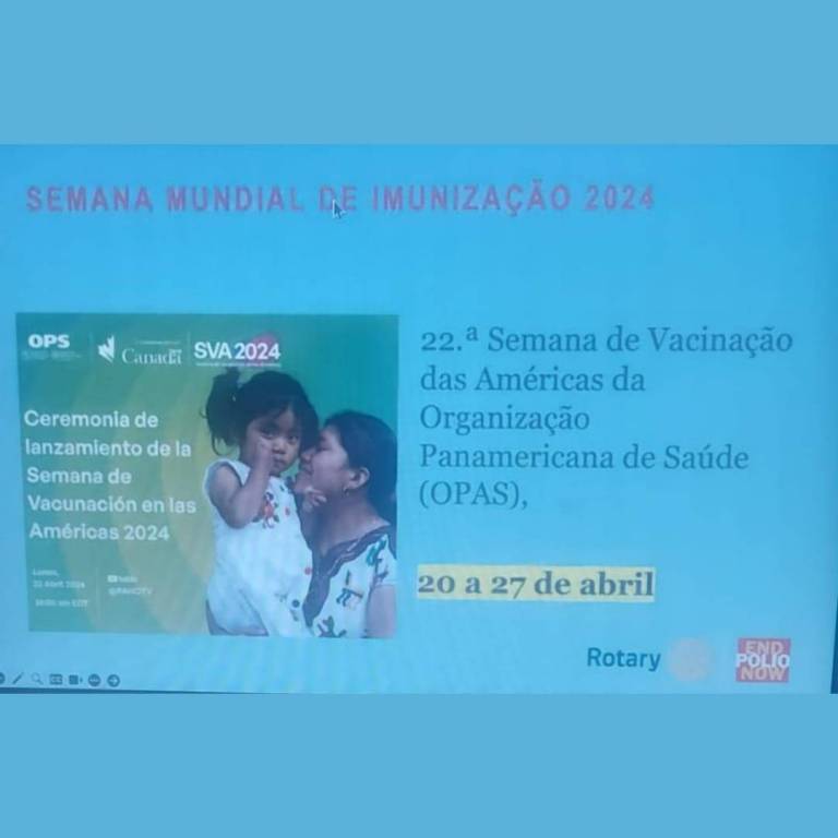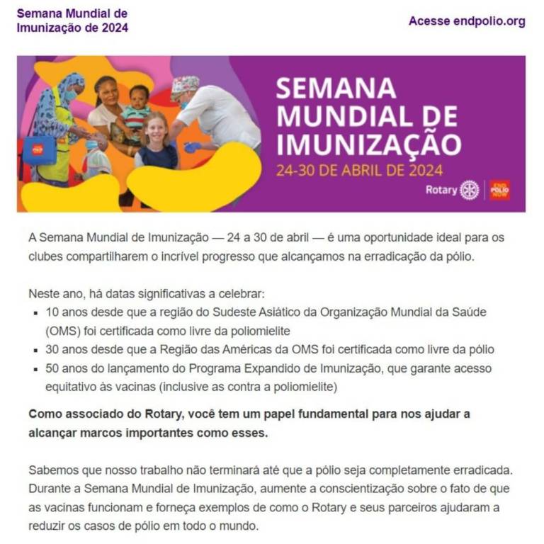 no mundo. Abaixo a frase: o Rotary acredita no poder da vacina e no combate à paralisia infantil. Acim dessa faixa esta escrito: Eventos Abril 2024 ao lado Rotary e roda rotária bem como Coordenação da End Polio Now. E, abaixo da faixa, uma tarja em azul claro: Como apoiar a campanha #EndPolio durante a Semana Mundial de Imunização. Abaixo dessa tarja, fundo branco com o seguinte texto: Explore o kit de ferramentas da semana mundial de imunização para encontrar artes gráficas e exemplos de posts que você pode compartilhar nas midias sociais com as hashtags #vacinasfuncionam e #EndPolio. Use uma reunião do clube para abordar a iniciativa de erradicação da pólio do Rotay. Organize um evento para aumentar a conscientização e arrecadar fundos ao Pólio Plus. Crie uma campanha de arrecadação pela plataforma Raise for Rotary e divulgue-a à sua rede de contatos. Abaixo, no rodapé, outra tarja azul claro: Não esqueça: seu distrito pode doar FDUC ao Pólio Plus para ajudar o Rotary a atingir a meta de arrecadação de Us$50 milhões por ano para a erradicação da pólio.
