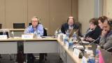 Audiodescrição: na foto, a montagem de duas fotos uma em cima da outra, na de cima, e pessoas sentadas de frente pra uma mesa, com microfones na mesa e computadores, e usam fone de ouvidos, nas extremidades homens e no centro mulheres. Na foto de baixo, uma mesa em L, com 5 pessoas sentadas, com fones de ouvido, garrafas de água na mesa, microfones e computadores.