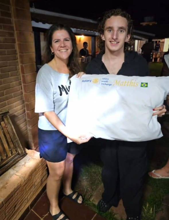 Audiodescrição: na foto, duas pessoas ado a lado, esquerda uma jovem cabelos longos, sorridente, do lado dela um rapaz de cabelos pretos, sorridente, seguram uma especie de travesseiro com fronha branca, com Rotary escrito em azul, desenho da roda rotária ao lad oem amarelo, Rotary Youth Exchange e ao lado em amarelo, Angel e a bandeira do Brasil. Atras deles, algumas pessoas dispersas. No chão, nota-se grama e pedaços de concreto no meio.