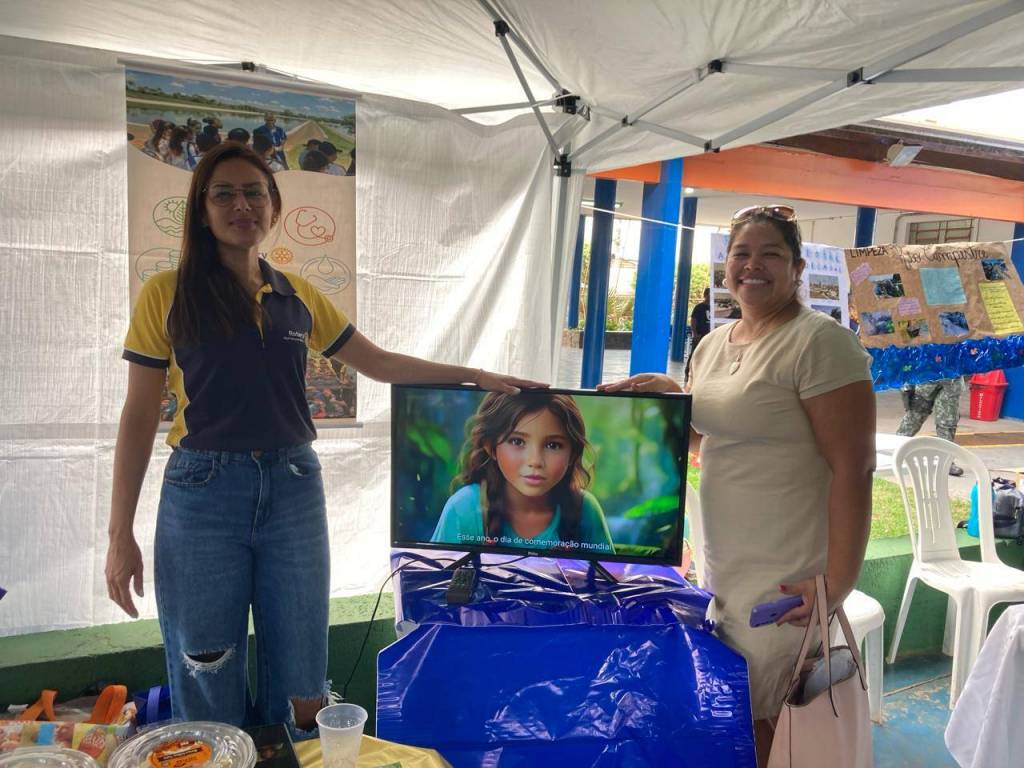 Audiodescrição: na foto, uma mesa com toalha azul e dourada, na mesa umas folhas sulfites penduradas com desenhos do planeta terra, de água, de grama, de rio. Em cima da mesa água, copo, refrigerante, uma plantinha. Atrás da mesa, lado esquerdo, uma criança sentada numa cadeira e do seu lado uma jovem com uma criança no colo. Ao lado, direito, duas jovens em pé, se abraçam, sorriem e posam para foto. Atrás delas um banner do Rotary Club Lins Norte com lema crie esperança no mundo. Estão todos embaixo de uma tenda branca.