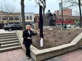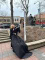 Na foto uma mulher loira vestindo calça preta, blusa branca e blaizer preto faz pose em local aberto parecido com uma praça. No local observamos uma escada, alguns carros na parte superior, árvores secas, de costas uma estátua de bronze e algumas construções ao fundo.