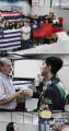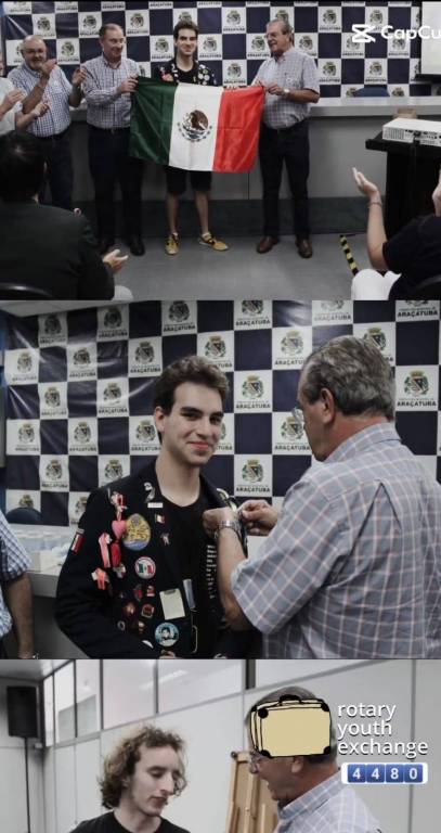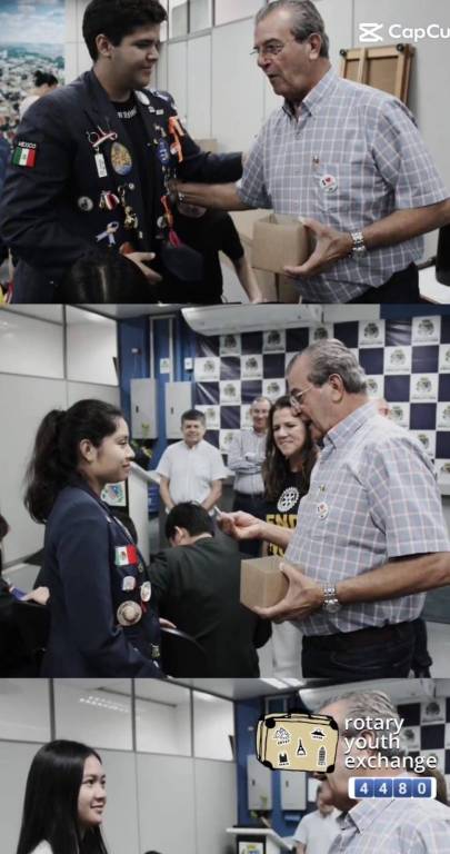 Na foto várias pessoas entre jovens e adultos de ambos os sexos são identificadas: muitos dos jovens vestindo seus blaizer azul marinho com vários botons distintos que os classificam como intercambistas. O restante das pessoas estão vestidas de maneira esporte. Bem na frente temos 3 bandeiras diferentes que estão sendo expostas por estas pessoas. O lugar é fechado, iluminado e ao fundo podemos observar um grande painel com a foto de uma cidade, com seus prédios e suas construções.
