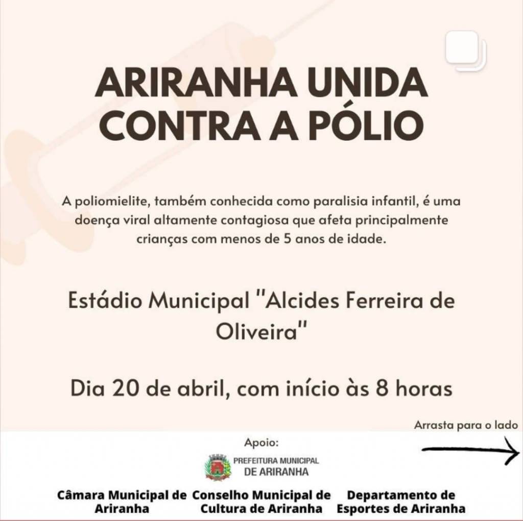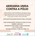 Audiodescrição: no card, de fundo clarinho, no topo: Ariranha Unida Contra a Pólio uma tarja 20 abril, 2024. Este projeto tem como objetivo arrecadar fundos para a campanha "End Polio Now", uma iniciativa mundial do Rotary International para erradicar a poliomielite. Abaixo, desenho e uma moça segurando uma crianã no colo, de frente pra eles um rapaz, de jaleco, segurando uma seringa. atrás do rapaz, desenhado, escrito: arrasta para o lado e uma seta para direita; No rodapé do card, realização e simbolos Rotary, Rotaract e Interact Clubs de Ariranha.