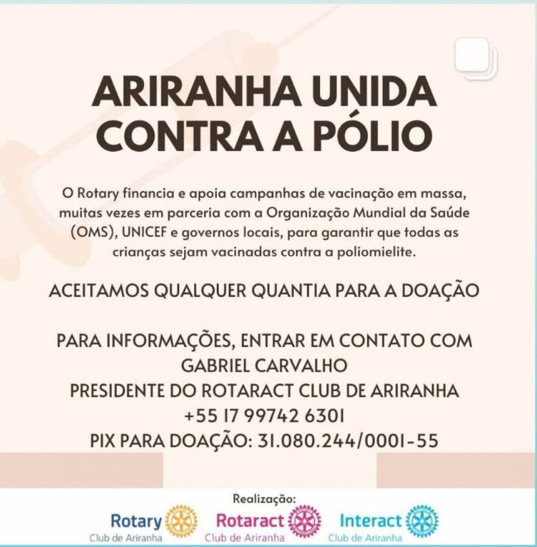 Junte-se a nós no Projeto Ariranha Unida Contra a Pólio no dia 20 de abril, a partir das 8 horas, no Estádio Municipal ‘Alcides Ferreira de Oliveira’! Vamos apoiar a campanha ‘End Polio Now’ do Rotary International e contribuir para a erradicação da poliomielite. Contamos com a presença e apoio do Rotaract Club de Ariranha, Interact Club de Ariranha e Conselho Municipal de Cultura de Ariranha. Juntos, podemos fazer a diferença!