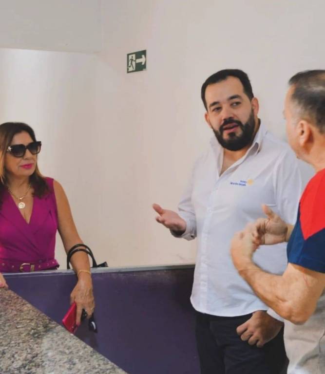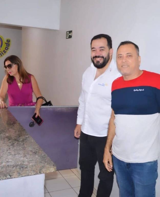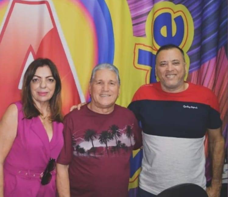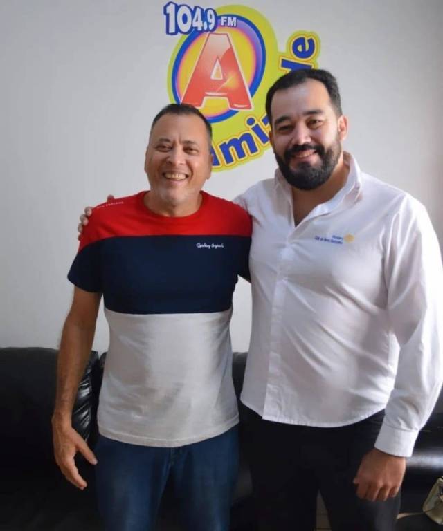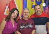 Audiodescrição: na foto, três pessoas identificadas, lado a lado, sorriem, lado esquerdo uma senhora de cabelos castanhos, usa oculos de sol, roupa rosa, do seu lado um rapaz de camiseta colorida cabelos curtos e escuro, ao seu lado, um rapaz de barba e cabelo escuro, camisa branca do Rotary. Atrás deles na parede, simbolo da 104.9 FM Amizade.