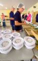 Audiodescrição: no video, imagem de várias pessoas, jovens, crianças e adultos montando marmitas de feijoada, sorridentes, fazendo entregas, acenando para quem está filmando. Os ambientes são um salão grande, com as caixas de marmitas e também na rua.