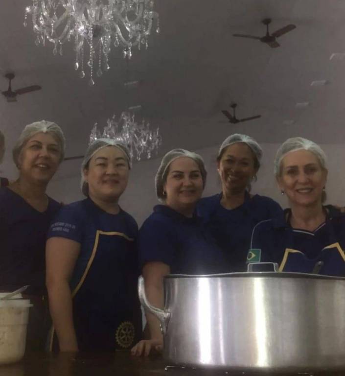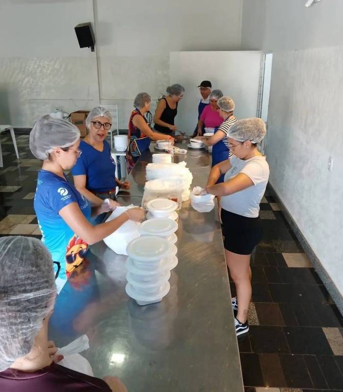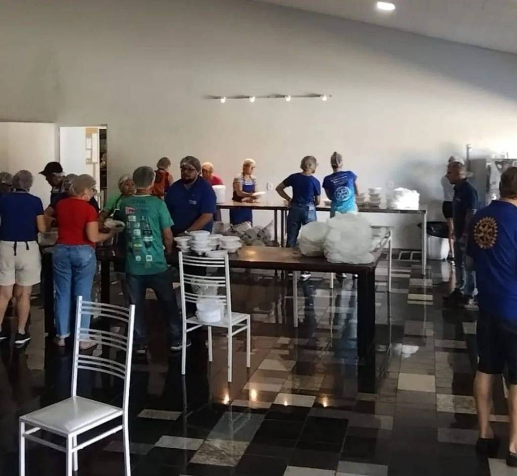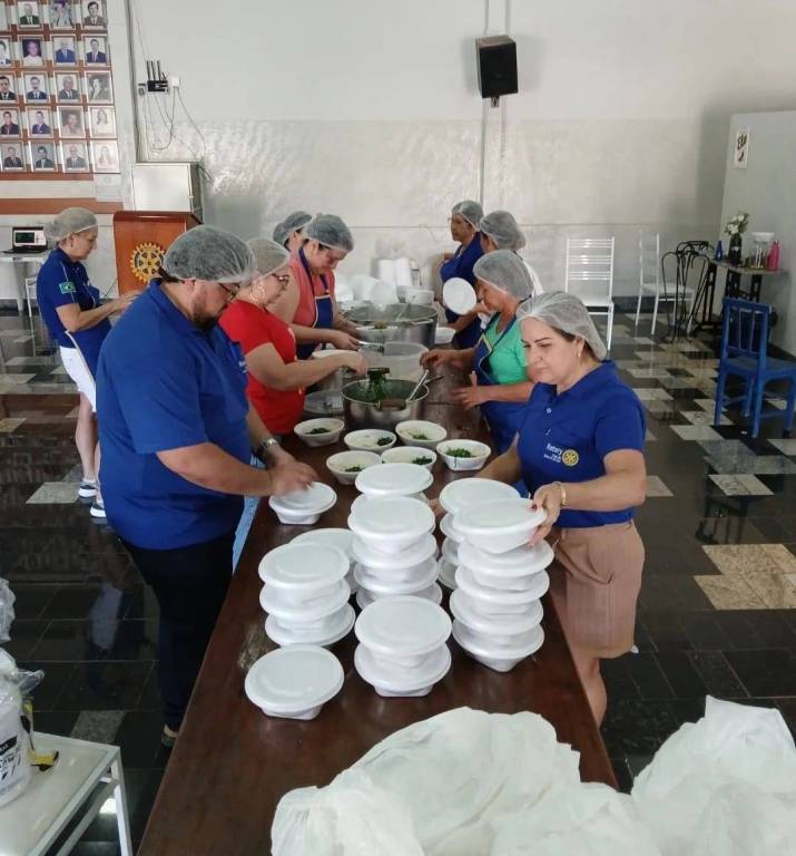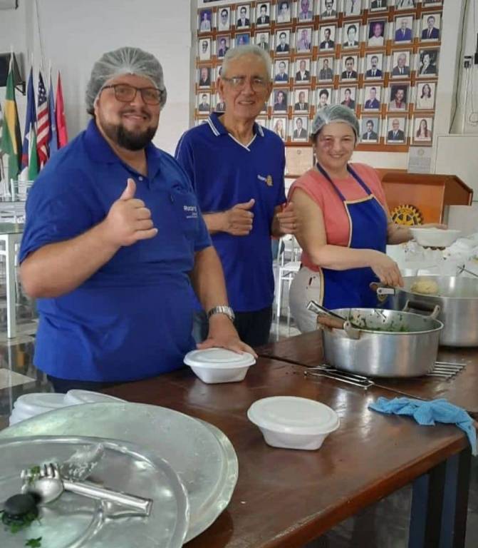 Audiodescrição: na foto, imagem de pessoas usando toca e montando marmitas em um salão grande, na frente um rapaz e uma senhora, ela de avental ele de camiseta azul do Rotary. No topo da foto escrito: produção e embaixo Feijoada.