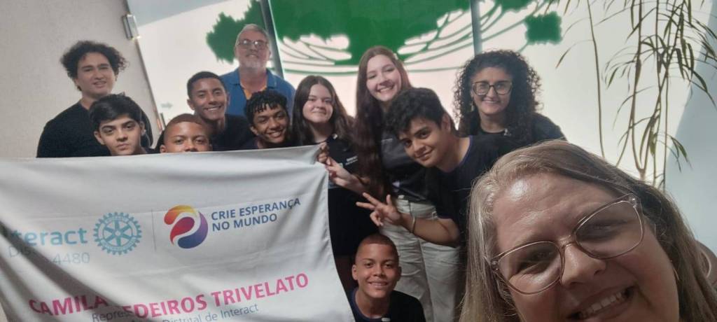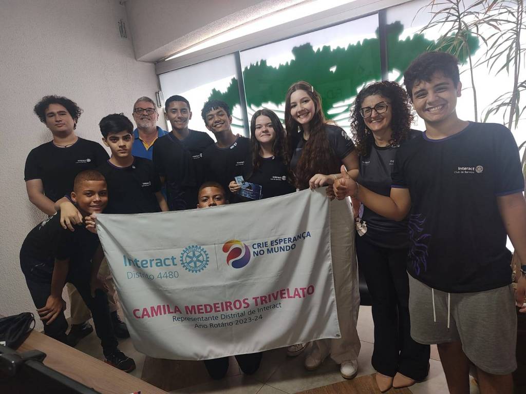 Eles seguram nas mãos e expõe uma bandeira branca com o símbolo do Interact Distrito 4480 em azul claro e ao lado a logo da gestão atual Crie Esperança no Mundo. Logo abaixo em letras rosa Camila Medeiros Trivelato.