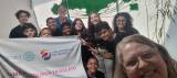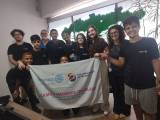 Na foto vários jovens entre meninos e meninas estão acompanhados de dois adultos; um homem com camiseta azul clara e uma mulher de cabelos escuros e usando óculos. Os jovens vestem camiseta escura.