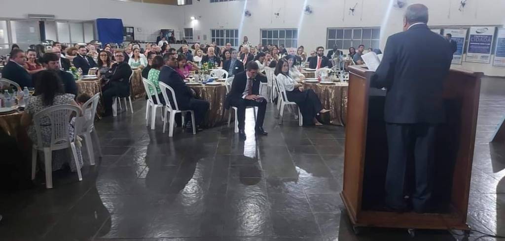 Audiodescrição: na foto, dois homens lado a lado, de terno, sorridentes, o do lado esquerdo segura uma sacola de presente como se estivesse entregando para o do lado direito, atrás deles, lado esquerdo, uma tribuna de madeira com desenho da roda rotária e pavilhão de bandeiras e do lado direito um banner com logo do Rotary Club de Araçatuba , e com lema do crie esperança no mundo.