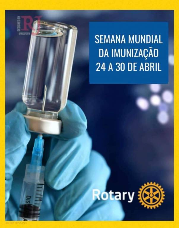 Card com fundo desfocado azul escuro, trás na lateral esquerda uma mão humana com luva azul clara manuseando uma seringa com a agulha entro de um frasco pequeno de vidro com tampa de metal prateado. Acima do fresquinho em letras claras desfocadas temos: Designed by RI. No canto superior direito dentro de um quadro azul em letras brancas: Semana Mundial Da Imunização 24 a 30 de Abril.