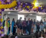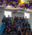 Na foto várias pessoas identificadas: um casal está de pé posicionados tendo a seu lado vários jovens entre meninos e meninas de pé e agachados na frente. Todos estão olhando pra o lado direito com certeza a espera do click. Provavelmente eles estão em cima de um pequeno palco. Atrás uma parede branca trás 2 grandes janelas onde entra a luz do sol, um ventilador grande, 2 aparelhos de ar condicionado e no teto que também é branco temos um grande cordão com vários balões de ar coloridos. À frente temos vários jovens de costas observando a pose da foto.