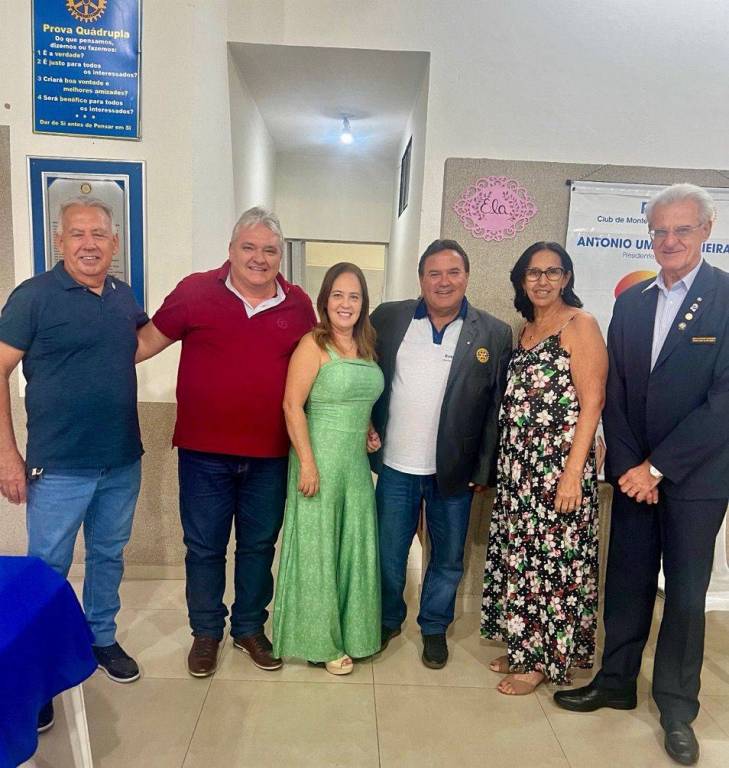 Da esquerda para a direita: um homem camiseta polo vermelha sorrindo, um homem de camiseta preta com amarelo e logo do Rotary, ao centro o Gov. do Distrito 4480, usando terno preto, gravata vermelha com os braços para frente do corpo segurando suas mãos, um homem de camiseta branca e um blaiser cinza por cima, sorrindo e um homem camiseta polo preta, braços para trás do corpo, sorrindo.