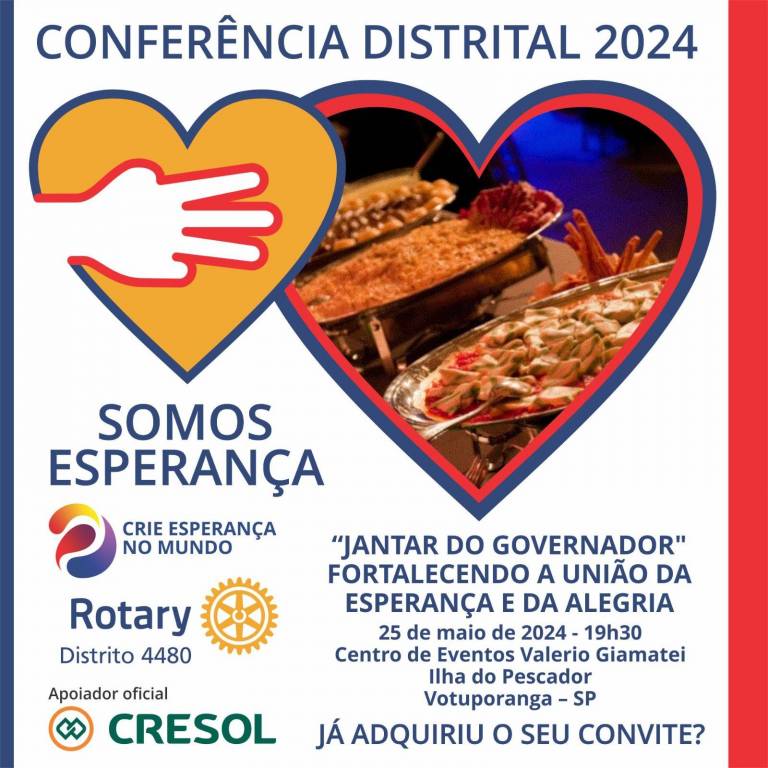 Audiodescrição: Card com o fundo branco, tendo uma tarja azul na lateral esquerda e uma tarja vermelha na lateral direita. No topo está escrito em azul "Conferência Distrital 2024". Logo abaixo do lado esquerdo há um coração amarelo com uma moldura em azul e o desenho de uma mão, com os 3 dedos do meio esticados, simbolizando "Esperança" em libras. Este coração está se sobrepondo em partes a um coração maior, localizado no lado direito da imagem, com a foto de pratos de comida expostos em um banquete. Este coração possui 2 molduras, a externa em azul e a interna em vermelho. Abaixo do coração do lado esquerdo da imagem, está escrito "Somos Esperança", com o lema presidencial da gestão 2023-24 - Crie Esperança no Mundo e, abaixo deste lema, encontra-se o logo do Rotary Distrito 4480, com as letras em azul e a Roda Rotária simplificada na cor amarela. Abaixo do logo Distrital está escrito "Apoiador Oficial", com o logo da CRESOL, com as letras em verde. Abaixo do coração do lado direito está escrito em azul "Jantar do Governador" - Fortalecendo a união da esperança e da alegria. 25 de maio de 2024 - 19:30h - Centro de Eventos Valério Giamatei - Ilha do Pescador - Votuporanga - SP - Já adquiriu o seu convite?