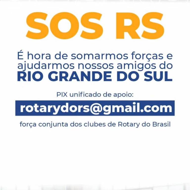 Audiodescriçao: Card com o fundo branco escrito na parte superior na cor amarelo SOS RS. Logo abaixo escrito em azul: É hora de somarmos forças e ajudarmos nossos amigos do Rio Grande do Sul. Pix unificado de apoio. Com o fundo azul escuro, os dados do Pix: [email protected]. Logo abaixo também centralizado escrito: Força conjunta dos Clubes de Rotary do Brasil.