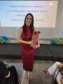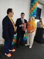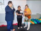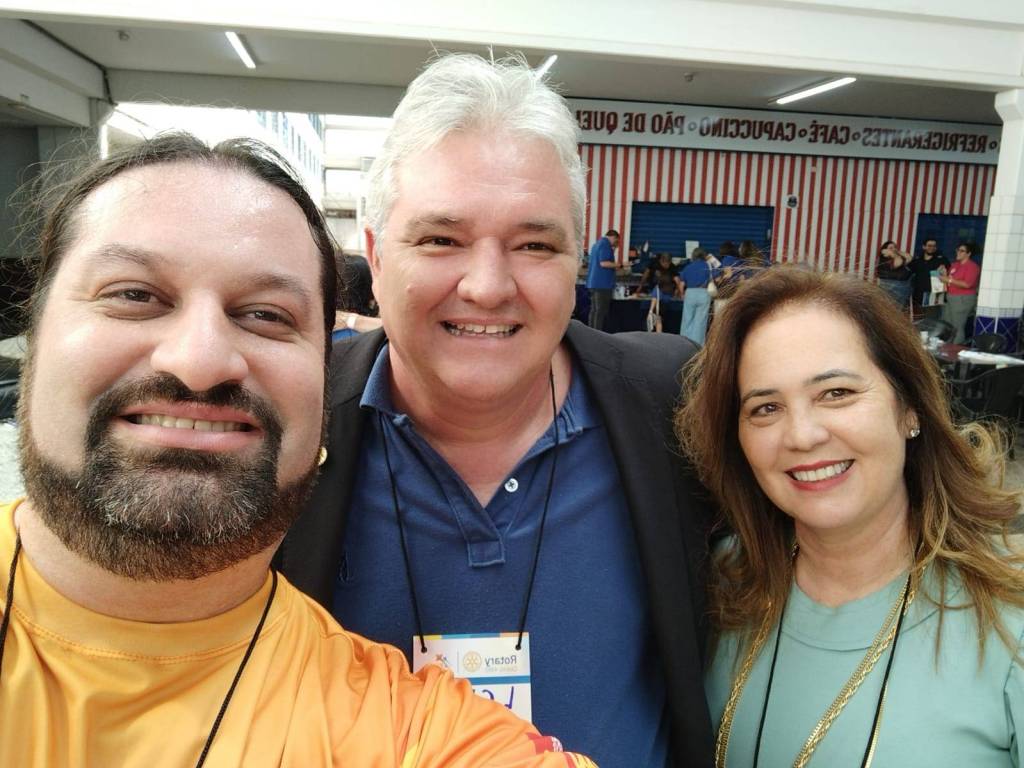 Audiodescrição: Foto onde 3 pessoas estão identificadas. Na lateral esquerda encontra-se o Gov. eleito do Distrito 4480 para a Gestão 2024-25 - Éder Bocchini, que está trajando um paletó escuro sobre calças jeans também escuros e tênis laranja, possui cabelos castanhos e usa óculos, está segurando um microfone e está virado para uma senhora com camisa e calça escuras, cabelos curtos e usa óculos, está segurando um certificado. ao seu lado está Nelly Bocchini, esposa do Gov. Éder, ela está de frente para a foto e sorri, possui cabelos claros curtos, veste uma camiseta laranja do evento, calças claras e possui um papel na sua mão esquerda. Atrás das pessoas é possível ver uma projeção, com uma estrutura de bexigas coloridas em arcos enfeitando o ambiente.