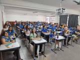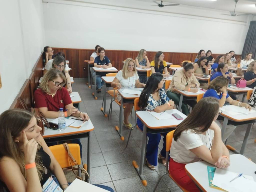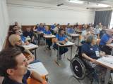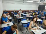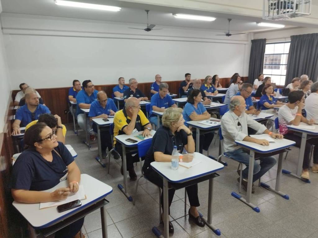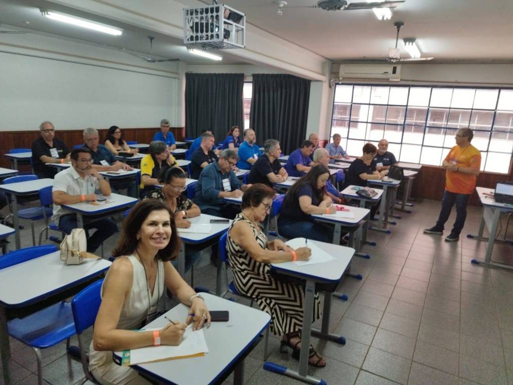 Audiodescrição: Foto de uma sala de aulas lotada sendo homens e mulheres das mais variadas idades. Todas as pessoas na foto sentadas em cadeiras, com carteiras escolares individuais. As paredes são claras na parte de cima, com tons terrosos na parte de baixo, na parede direita ao fundo é possível ver uma janela de vidro, tendo as demais janelas com cortinas escuras fechadas. No teto da sala é possível ver uma grade com um projetor fixado.