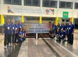 Audiodescrição: Foto da comitiva de Santa Fé do Sul tirada na entrada do pátio da Unorte, onde é possível ver o nível superior do prédio com janelas de vidro com armação de metal e um banner branco fixado na parede ao fundo, onde se lê " A Unorte deseja a você muito sucesso em sua vida profissional", com elementos gráficos nos cantos superior direito e inferior esquerdo, tendo uma arte que não é possível identificar na lateral direita, tendo ao lado direito deste banner a bandeira do Brasil. O chão é de blocos de pedras lisas de diferentes tonalidades. No andar térreo estão, na frente do banner do evento do Rotary, 4 homens em pé com 2 mulheres agachadas do lado esquerdo da foto. Do lado direito da foto temos, da esquerda para a direita: Em pé uma jovem interactiana, uma jovem do programa de intercâmbio, uma mulher loira e 2 rapazes, agachados temos uma jovem rotaractiana, acompanhada do casal Pres. do Rotary Club de Santa Fé do Sul. O Banner do evento possui no canto superior esquerdo o logo do Rotary - Distrito 4480, com as letras em azul e a Roda Rotária em amarelo, ao centro está o lema 2024-25: A Magian do Rotary, composta por 4 estrelas de 4 pontas ascendentes, tendo a maior delas no canto superior direito na cor laranja, no canto inferior direito em amarelo e as 2 do lado esquerdo em tons de azul, sendo a de cima em um tom mais claro. No canto superior direito do banner está o Logo Distrital Irresistível para a gestão 2025-25 "Seja o bem - Vindo ao Rotary" - Na parte inferior do testo está escrito: "Equipe Irresistível! Seja o Bem, Vindo ao Rotary".